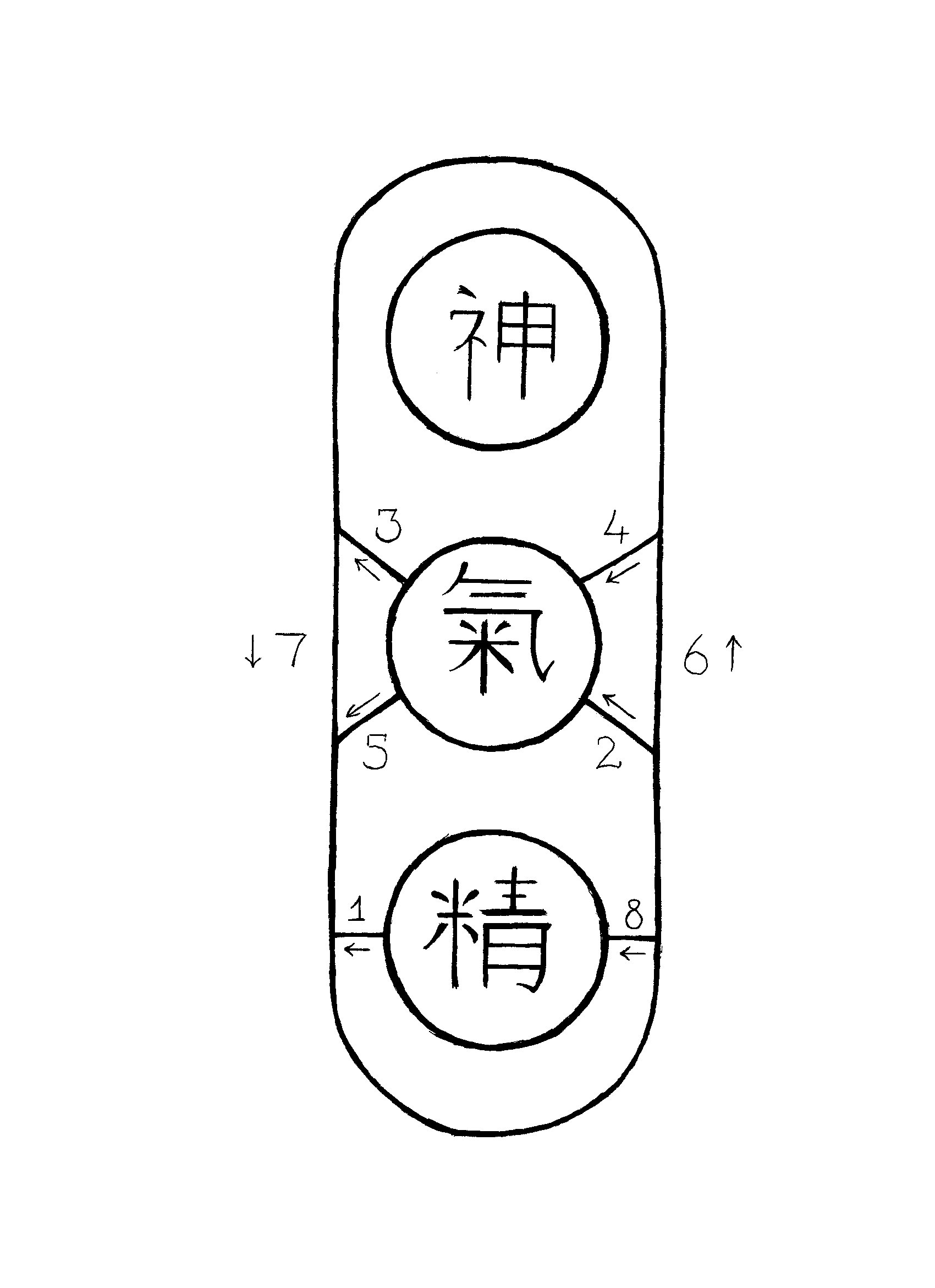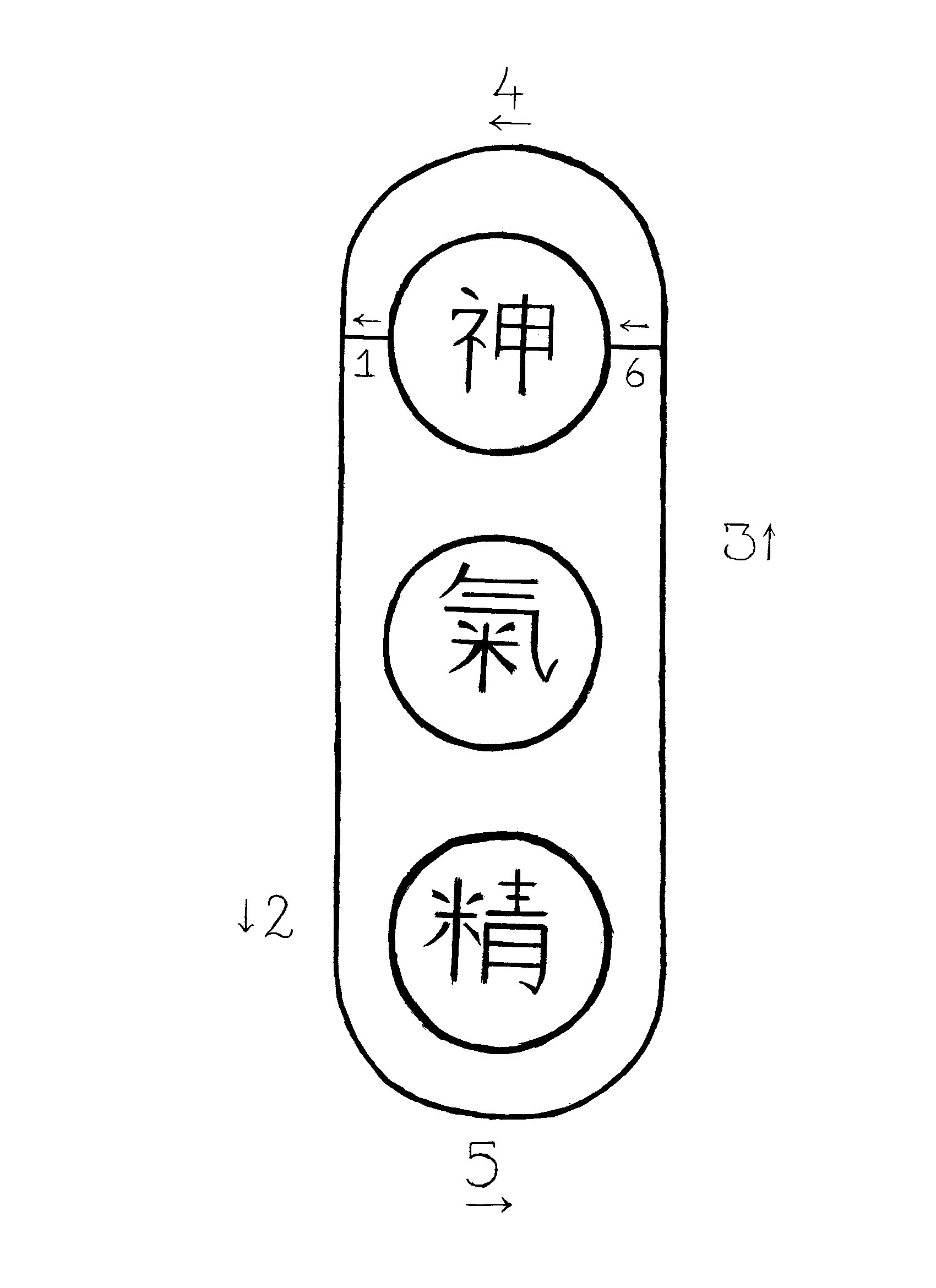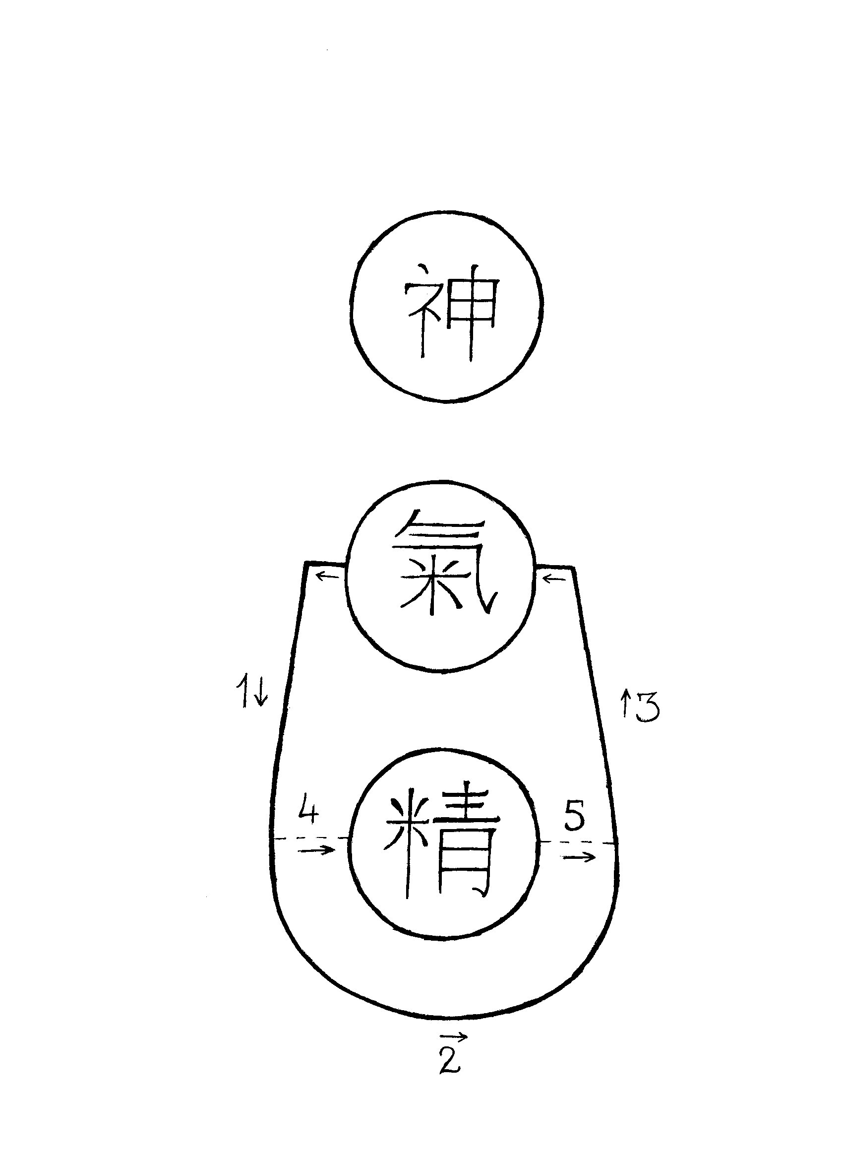Qi burns around Jing and sort of behave like magma and lava. Magma moves below (1 and 2), Lava moves above (3). As it circulate around Jing, you must collect the heat/fire (4 and 5).