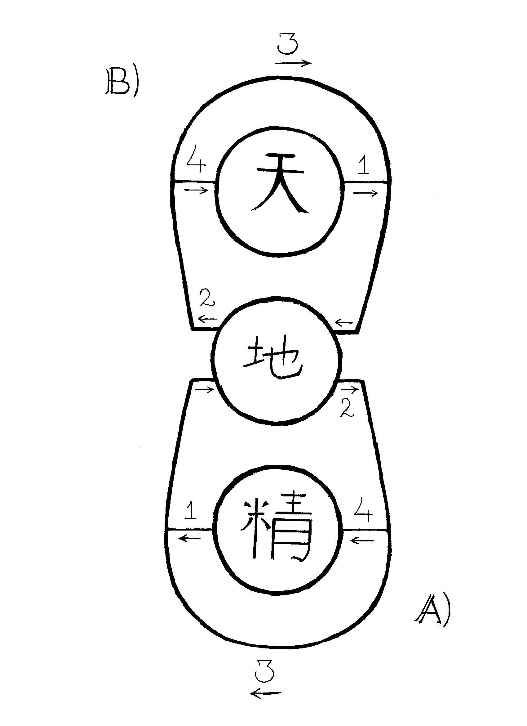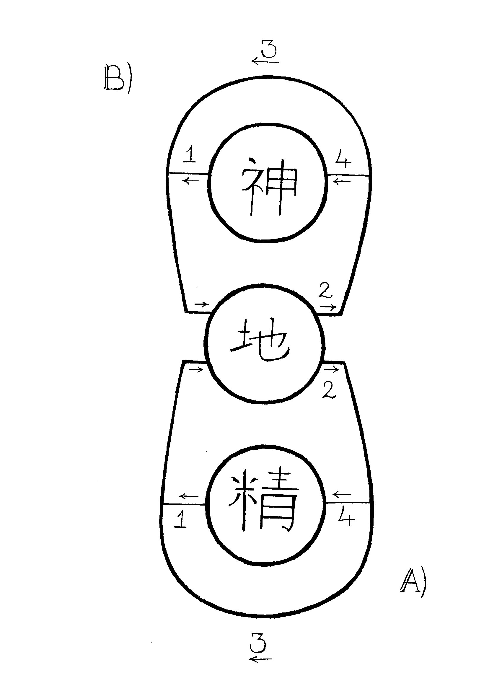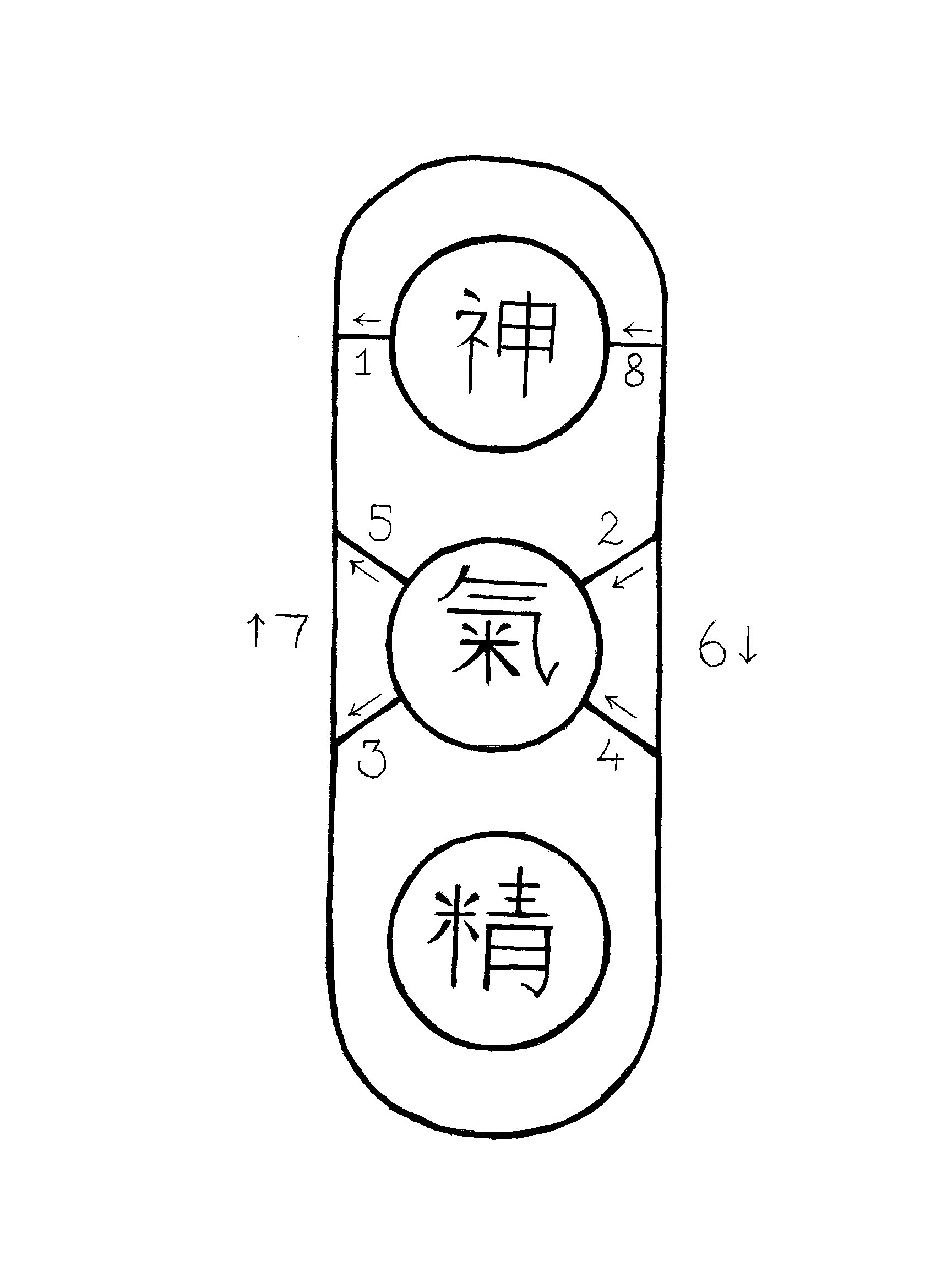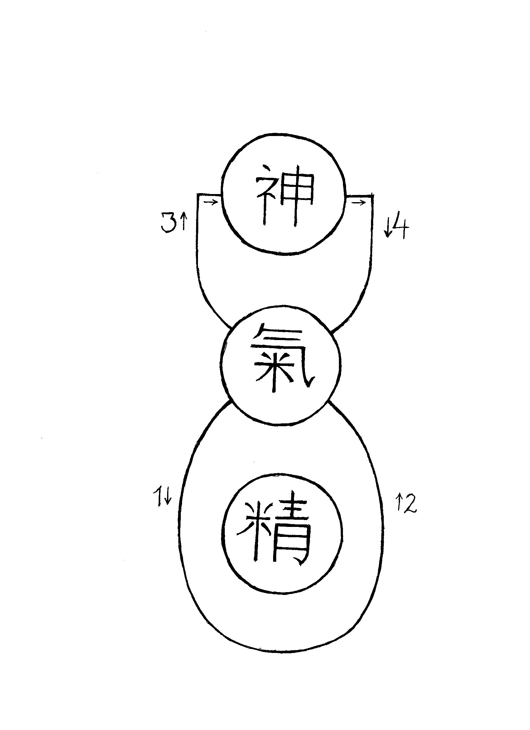 Qi burns around Jing and sort of behave like magma and lava. Magma moves below (1 and 2), Lava moves above (3). As it circulate around Jing, you must collect the heat/fire (4 and 5).