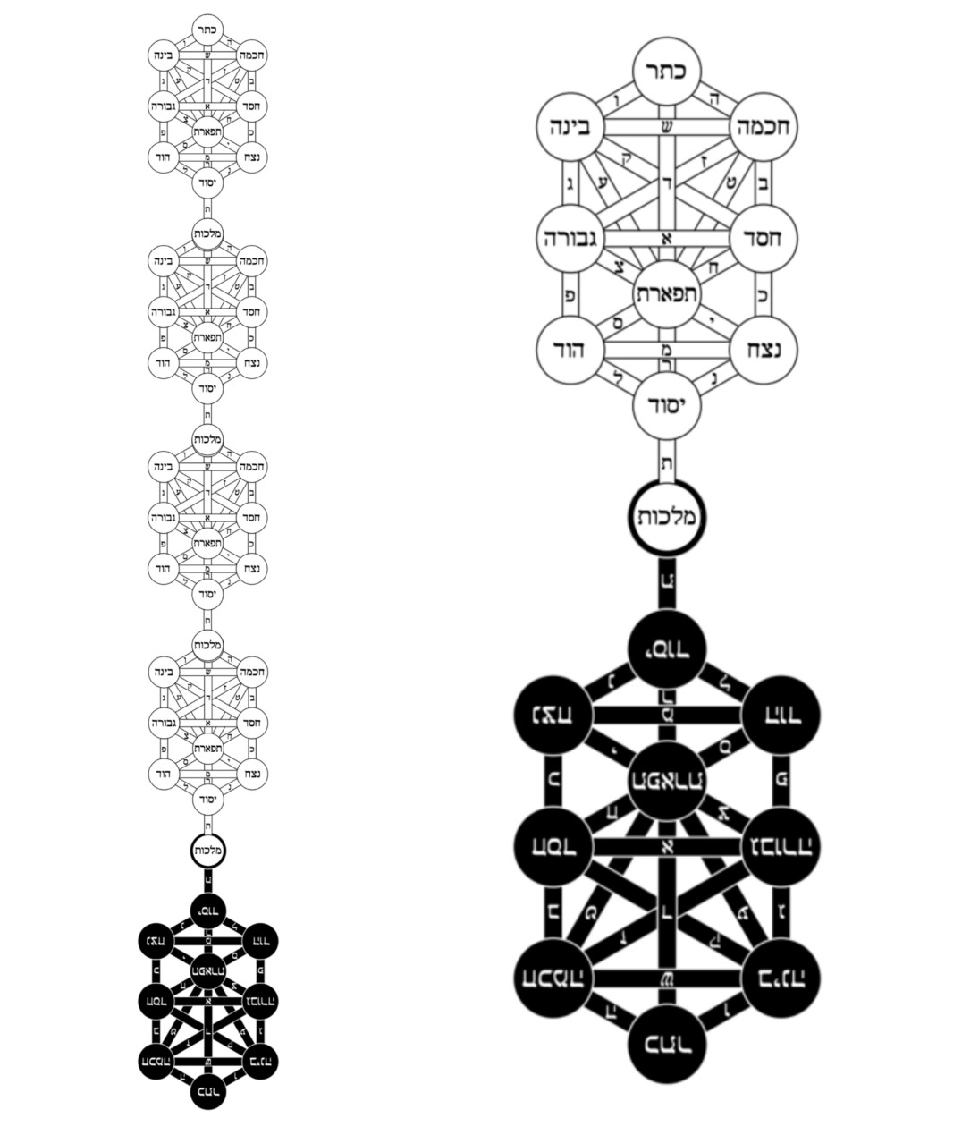Agreed. 100%. Here is my own diagram I posted earlier which includes the "other-side". It's not perfect, but I think it does a good job of illustrating the "other-side", and it's position on the "map" surrounding the material realm. This is indicated by the dark circle surrounding the white circle in the lower 4th of the chain. The components of the "other-side", the dark tree, is included in this dark circle surrounding the white one labled "מלכות".